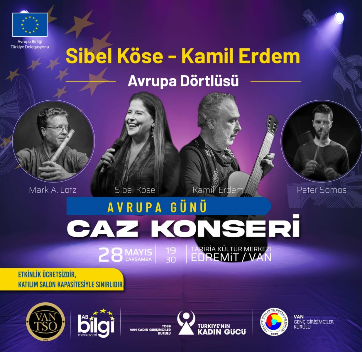 AB Türkiye Delegasyonu Desteği ve Van Ticaret ve Sanayi Odası AB Bilgi Merkezi tarafından organize edilen konser 28 Mayıs Çarşamba günü Saat: 19:30'da Edremit’te bulunan Tariria Kültür ve Gastronomi Merkezi salonunda gerçekleşecek. Konserlerde, cazın evrensel diliyle farklı kültürler bir araya geliyor. Latin ve dünya müziğinden seçkin eserlerin yer aldığı repertuar, Portekizce, İtalyanca, Fransızca, İngilizce ve İspanyolca şarkılarla izleyicilere çok dilli bir müzik deneyimi sunuyor. Avrupa’dan katılan bu sanatçılarla birlikte sahne, gerçek anlamda kültürlerarası bir buluşma noktasına dönüşüyor. Bu özel konserler, ilgili şehirlerde faaliyet gösteren Avrupa Birliği Bilgi Merkezleri tarafından organize ediliyor.