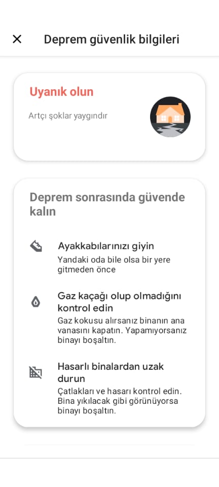 Vatandaşlar, Google Play Hizmetleri’nin “03.21 itibariyle deprem oldu” başlıklı bildiriminde, “Sarsıntıyı hissetmiş olabilirsiniz. Yaklaşık 155,4 kilometre uzaklıkta, ilk tahminlere göre 5,5 şiddetinde... Daha fazla bilgi için dokunun” şeklinde uyarı aldı. Gelen bildirimin detaylarında ise "Uyanık olun artçı şoklar yaygındır" başlığıyla deprem konsunda yapılması gerekenlerle ilgili bilgiler yer aldı.Bazı sosyal medya kullanıcıları gelen uyarıyı yararlı buldu.