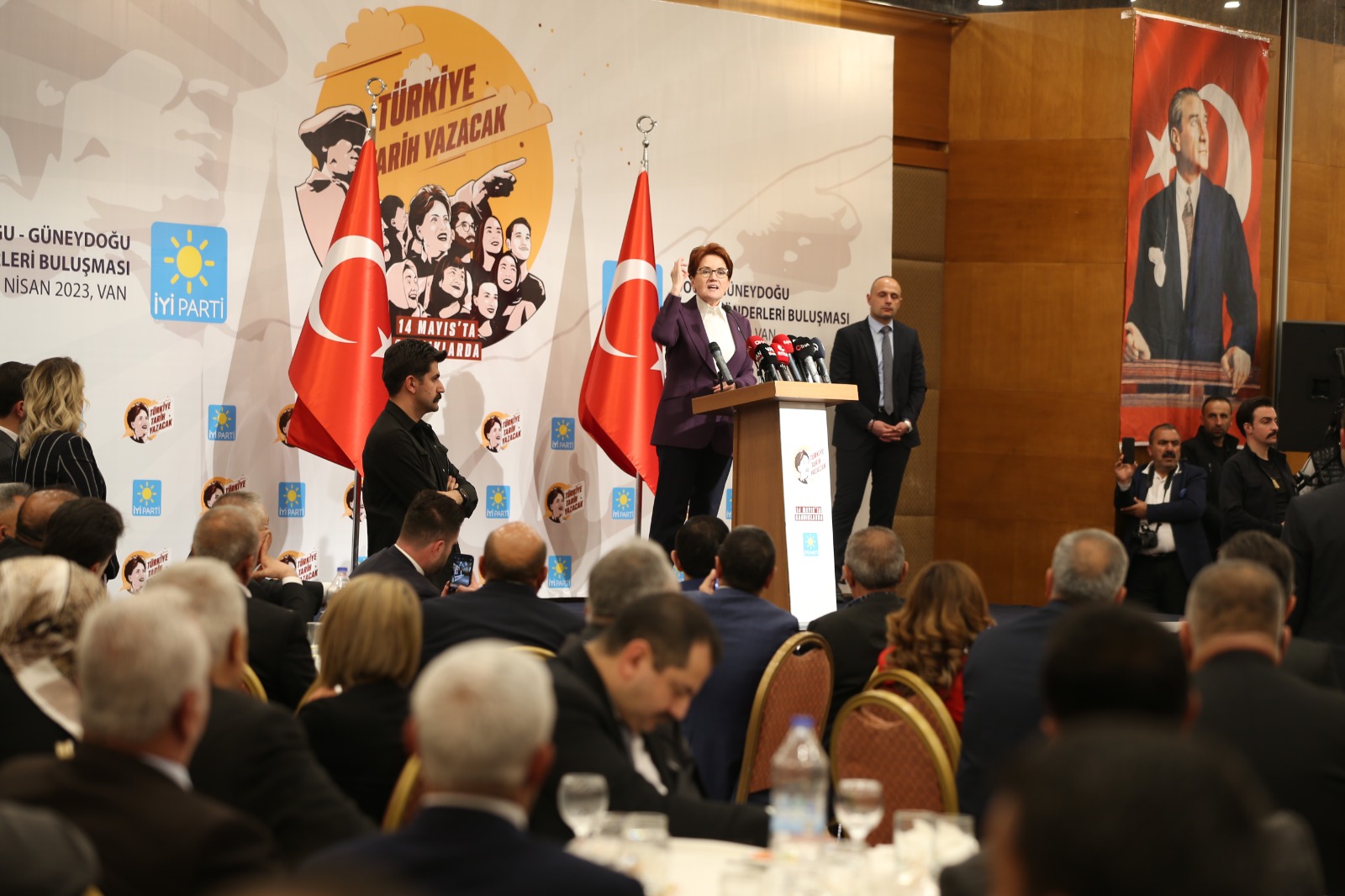 İYİ Parti Genel Başkanı Meral Akşener, buradaki ziyaretinin ardından, Doğu-Güneydoğu Kanaat Önderleri Buluşması programına katıldı. Burada da bir konuşma yapan Akşener, "Bu ülke kurulduğu zaman neye göre kuruldu biliyor musunuz? Nüfus cüzdanına göre kuruldu. Herkesin nüfus cüzdanı bir hissedir. Hangi dini inançtan, hangi mezhepten, nereden olursan ol, o nüfus cüzdanı ağadır, paşadır, beydir. O nüfus cüzdanına sahip olan herkes bu ülkenin de sahibidir. Tek kişinin iki dudağı arasına sıkıştırılmış bir siyasi yöne döndük ve o benim adına ucube sistem dediğin Türk tipi başkanlık sistemine döndü. Döndük ne oldu? O günden beri bürokrasi çok daha arttı. Valiler bir siyasi partinin neredeyse il başkanından ileri oldu. 82 puan almış çocuklar, AK Parti bünyesinde eğer tanıdığı yoksa atanamadılar. AK Parti bünyesinde tanıdığı olan çocuklar ise 52 puanla atandılar. Vatandaşlık hakkı bu ülkenin sahibi olma hakkının sevgiyle sevgisizlikle hiçbir alakası yoktur. Saygıyla alakası vardır. Kürt doğduğun için saygıyı hak ediyorsun. Bu ülkenin asıl sahibisin. Ben de Türk doğduğum için saygıyı hak ediyorum ve ben de asıl sahibiyim. Bütün mesele budur. Dolayısıyla birbirimize saygı duymak durumundayız. Ama biz bunları kaybettik. Allah rızası için manevi mevzularımız üzerinden birbirimizle itişmeyelim ki seçmen velinimet olsun. Her bir siyasetçi gelsin. Oylarınızı almak için topuk selamı versin. 'Hazır ol'da dursun ve sizlerin oylarınıza talip olsun” şeklinde konuştu.