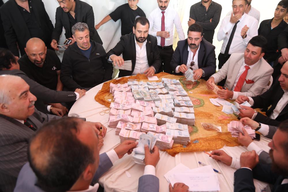 100 küçükbaş hayvanın kesildiği düğünde, yemek ikramının ardından geçilen takı töreni 5 saat sürdü. Damada 6 milyon TL nakit para, geline ise 4 kilo altın takılan düğün, son yılların en çok takı takılan düğünü olarak hafızalara kazındı.,